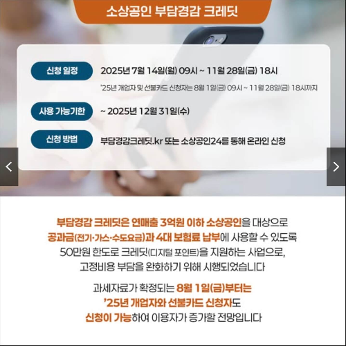 | 일반 소상공인 | 2025년 7월 14일 ~ 11월 28일 | 부담경감크레딧.kr 또는 소상공인24 |
